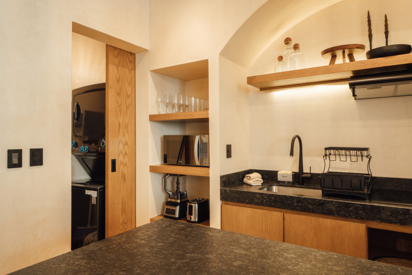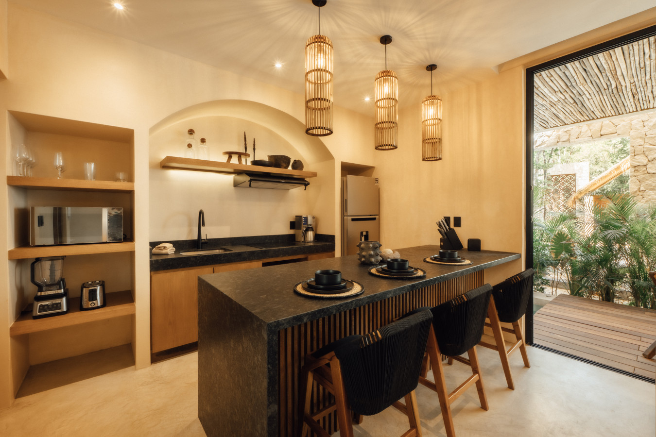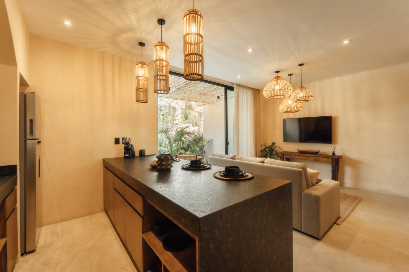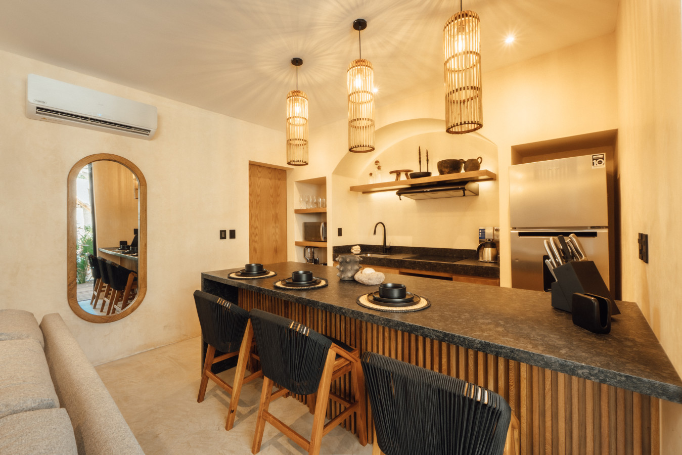 November 2025 5.00Tastefully designed condos but a little remote. Positive: Beautifully designed and decorated interiors, good quality furniture and appliances, very comfortable bed, great rooftop pool and common area. Beautiful greenery and huge cactuses. Surrounded by lush jungle. Negative: The location is a little remote, on the unpaved road. It is about 10 min car ride from the center of Tulum and relatively close to the beach, but you need either a car or a taxi to get there.