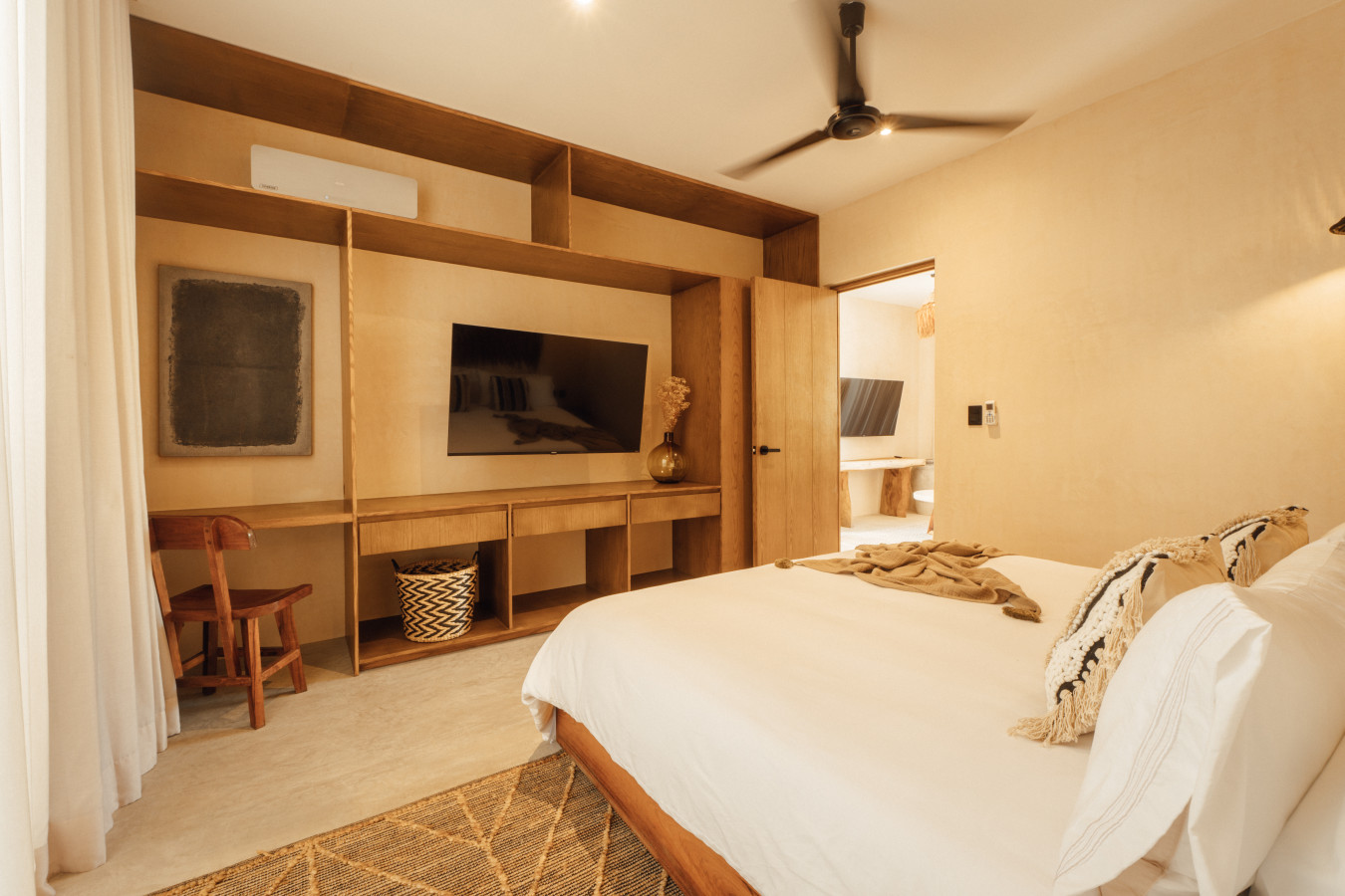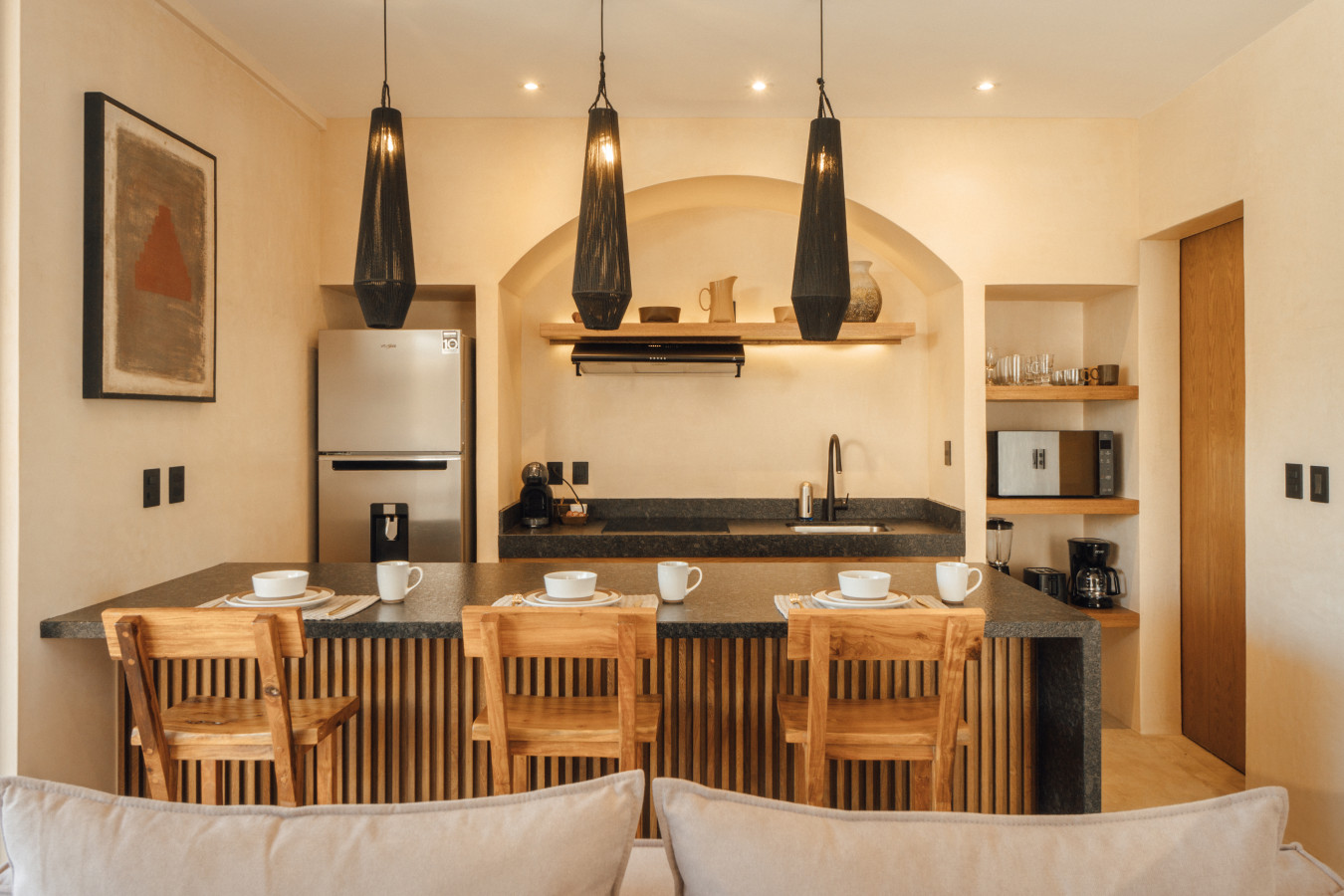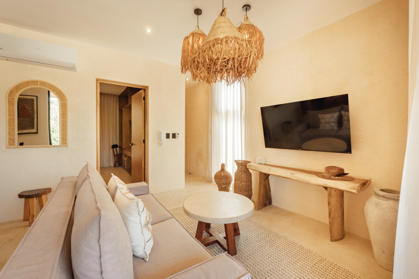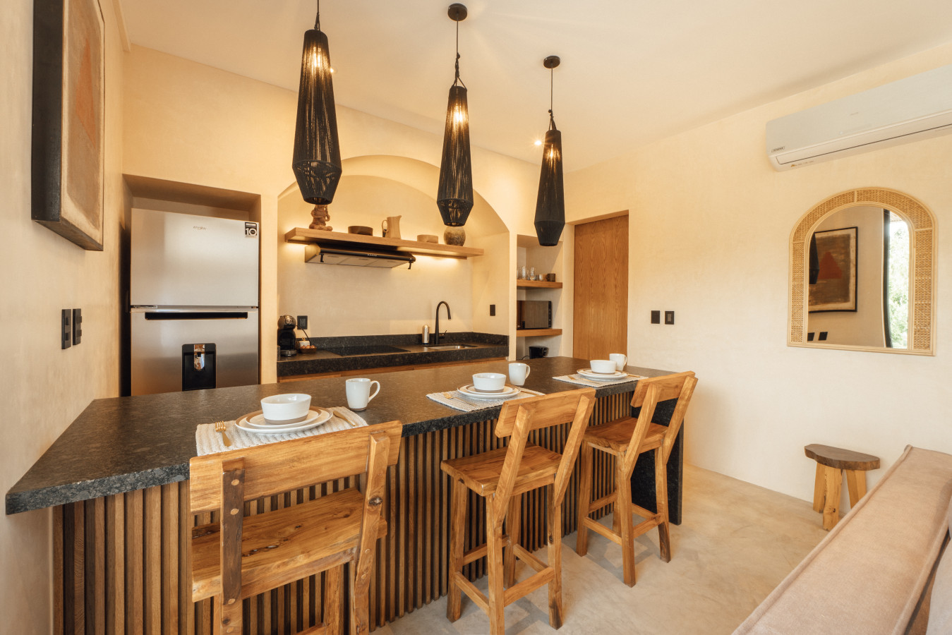 / nightStep into your apartment, where neutral hues and natural textures blend for a welcoming ambiance. This unit offers a private plunge pool, a complete kitchen with premium appliances, a sumptuous king bed, and a sofa bed accommodating up to four guests. Enjoy the convenience of an in-unit washer and dryer. Plus, access two stunning communal pools for sun-soaked relaxation. Experience the magic of Tulum at Satori, nestled in Region 15 just 6 minutes from the main avenue and 1 km into the jungle, providing the perfect blend of tranquility and easy access to the action. Only 3.5 km away, dive into the vibrant hotel zone, with its numerous beach clubs lining the stunning Caribbean coast. The route from Tulum Avenue offers convenient access to shops, restaurants, pharmacies, and a gas station. For a lively evening, the renowned Calle 7 in La Veleta, with its eclectic mix of restaurants, bars, and boutiques, is just a short trip away. Arriving at Your Tulum Escape: We want your arrival to be as seamless as possible. You’ll find convenient parking available directly in front of the condo. We recommend you download the directions and the internet password for the common areas so you can access the access code for your accommodation Check-in: 4:00 PM Check-out: 11:00 AM Housekeeping: Complimentary Housekeeping: Enjoy a free cleaning service every seven days of your stay. This includes tidying up the bathrooms and kitchen, making the beds, and cleaning the floors. Extra Cleaning: If you’d like a more thorough cleaning or more frequent service, just let your concierge know. (Additional fees apply and are subject to availability). Bedding & Towels: Linen Changes: For stays longer than seven days, fresh linens and towels will be provided during your complimentary cleaning. In-Unit Laundry: For your convenience, each unit has a washer and dryer. You can also request extra linen changes through your concierge for a small fee. Electricity: Power Supply Notes: Due to ongoing development in Tulum, occasional power outages may occur due to work by the CFE (Mexico's Federal Electricity Commission). These outages are sometimes announced in advance, but schedules can change. During the rainy and hurricane seasons, outages can be more frequent and last longer. What We Provide: We have flashlights and rechargeable fans available for your use. Electricity Usage: We’ll take a meter reading at check-in and check-out. Your reservation includes ___ kw/h per day. Usage beyond this will be charged at __ per kw/h. Internet Access: Wi-Fi Details: You’ll receive the Wi-Fi network name and password upon arrival. Tech Support: Please contact your concierge if you experience any issues with the internet. Possible Disruptions: Internet service may be affected during heavy rains and hurricanes. Water: Tap Water: The tap water is not suitable for drinking or cooking, but it’s perfectly safe for brushing your teeth and showering. Waste Disposal: Recycling & Trash: Each unit has separate bins for organic and inorganic waste. Trash Removal: Our housekeeping staff will empty the trash during your complimentary cleanings. There are also larger bins available for guests outside the building. Air Conditioning: Optimal AC Use: The ideal setting for the mini-split AC units in this area is 24°C (75°F). Maintenance Requests: Please report any issues with the AC immediately. Responsible Use: Please turn off the AC/heating when you leave the unit. Hot & Cold Water: Faucet Operation: In Mexico, turning the tap to the right is for cold water, and turning it to the left is for hot water. Hot Water Warm-Up: Please note that it may take a few minutes for the hot water to come through. Your Well-being is Our Priority: At Satori, we value communication with our guests and look forward to meeting you. We will be available at the property from 9:00 a.m. to 6:00 p.m. to provide you with the best service. . In case of an emergency outside of these hours, please contact any member of our staff or the security guard, who will be ready to assist you. Relaxed among nature It is advisable to rent a car, or motorcycle for easy access to the beach and town. Bikes rented on site. Welcome to Satori Tulum, an exclusive sanctuary nestled in the heart of Tulum’s lush jungle. Here, luxury meets nature in perfect harmony, offering you an unparalleled getaway that blends refined architectural design, high-quality natural materials, and vibrant greenery. Immerse yourself in an oasis featuring two spectacular main pools, thoughtfully curated spaces, and a serene ambiance designed to inspire relaxation and connection. While our location is a quick 7-minute drive from both Tulum’s vibrant town center and pristine beaches, the tranquil jungle setting ensures a peaceful retreat from the bustle. Please note that construction is ongoing nearby, with light noise possible between 9 am and 7 pm. However, the serenity of Satori Tulum and its wealth of amenities will undoubtedly make your stay memorable.